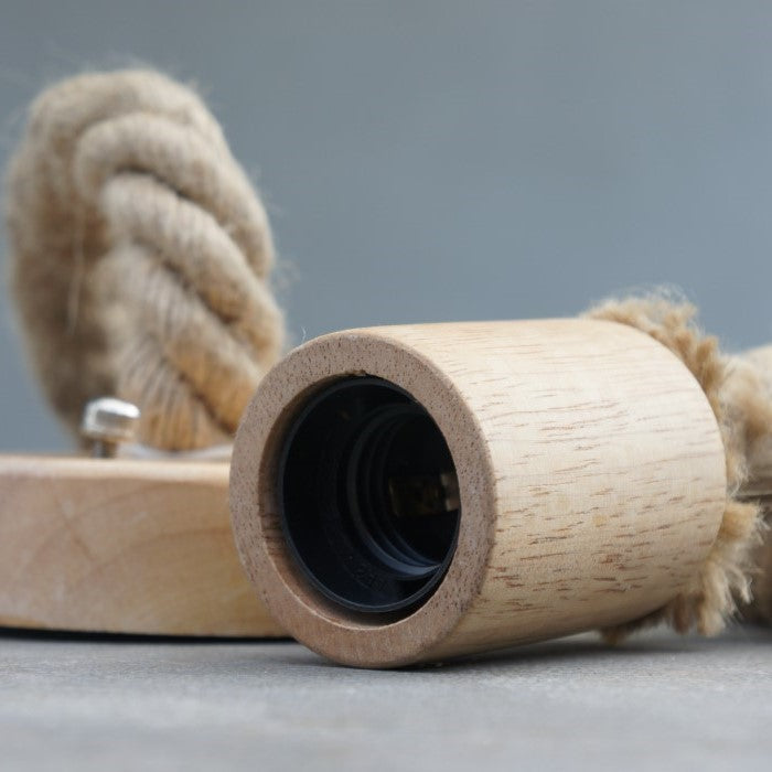 Stoere hanglamp met dik touw en massief hout, ideaal voor warme sfeer in woonkamer of hal. E27 fitting voor sfeervolle LED-lamp.