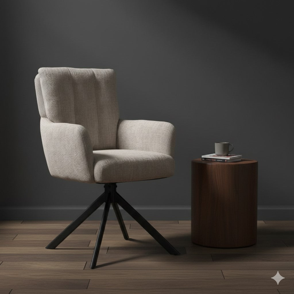 Stijlvolle eetkamerstoel met zachte stoffen bekleding en draaibare zit voor extra comfort. Comfortabel zitten zonder in te leveren op design